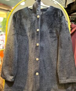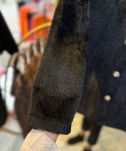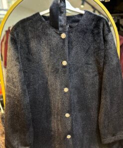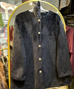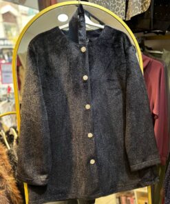 Zamansız siyah tonuyla şıklığın en sade ve güçlü halini sunan bu angora dokulu kemerli ceket, gold düğme detaylarıyla modern bir ışıltı kazandırır.