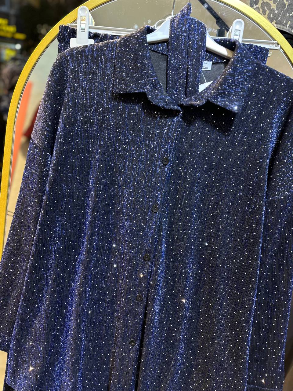 Zarif ışıltısı ve rahat kalıbıyla öne çıkan bu örme taşlı takım, hem günlük şıklıkta hem özel günlerde tercih edilebilecek modern bir parça. Yumuşak örme kumaşıyla gün boyu konfor sunarken, ince taş işlemeleriyle ışığı zarifçe yansıtır. Üst kısmı düğmeli gömlek formunda, alt kısmı ise kemer detaylı etekle tamamlanmıştır.