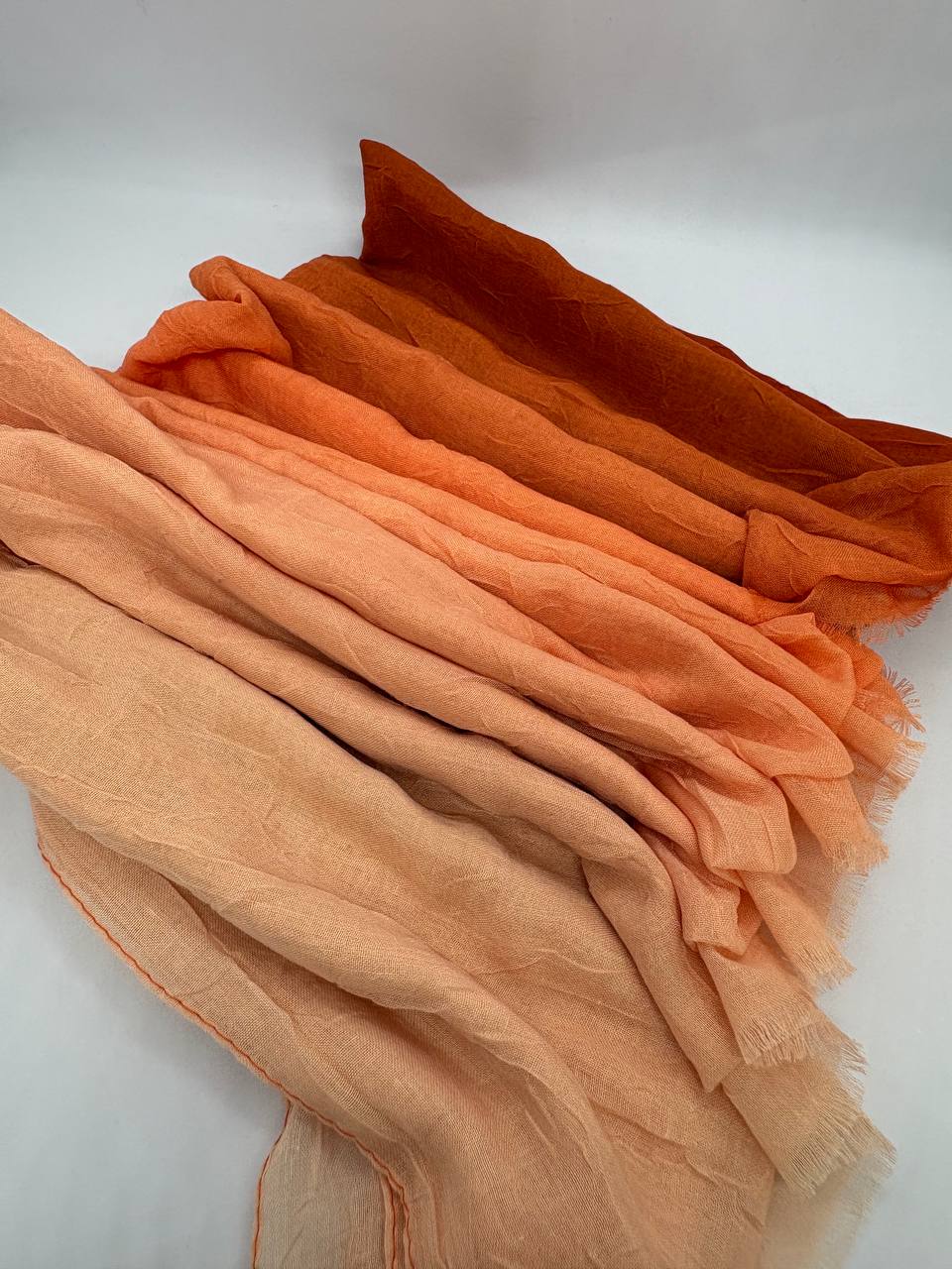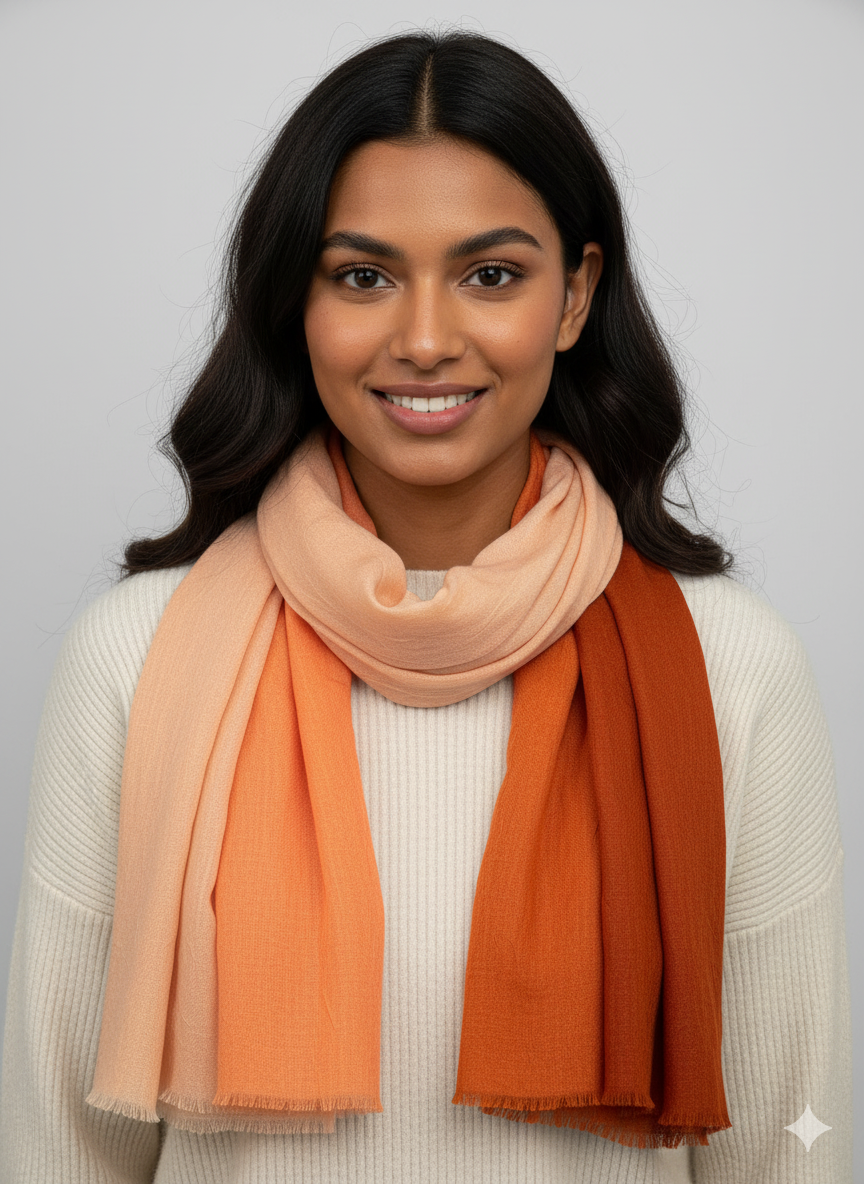 Şeftali tonlarının açık bejden canlı turuncuya doğru zarif bir geçişle buluştuğu bu degrade şal, enerjik ve sıcak görünümüyle dikkat çeker. Yumuşak dokusu ve hafif kumaşı sayesinde konforlu bir kullanım sunar. Günlük kombinlerde canlılık, klasik kombinlerde ise zarif bir kontrast yaratır.